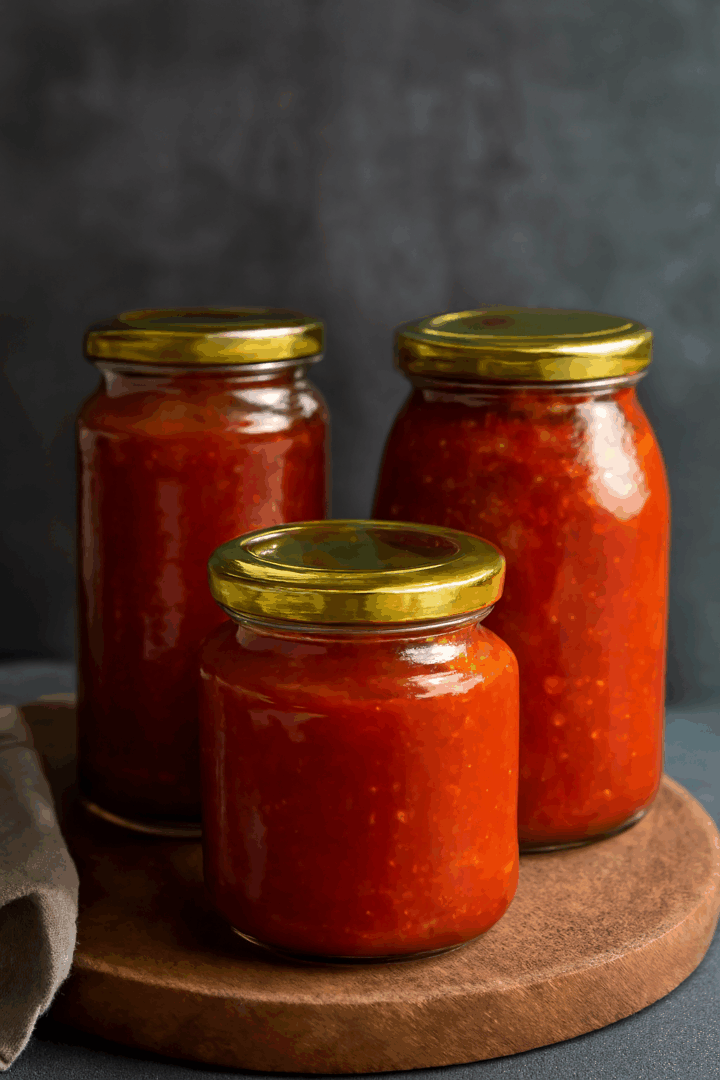 Smaż na małym ogniu, często mieszając, przez 40–60 minut, aż ajvar zgęstnieje. Pod koniec dodaj ocet, sól, cukier i pieprz. Jeśli chcesz wersję ostrą – dodaj drobno posiekaną chili.