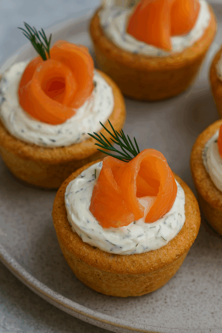 Udekoruj rulonikiem z łososia i gałązką koperku.