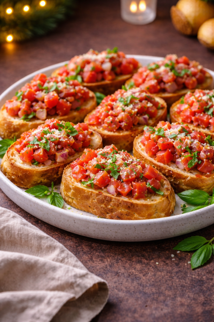 Na ciepłe kromki nałożyć porcję pomidorowej mieszanki.