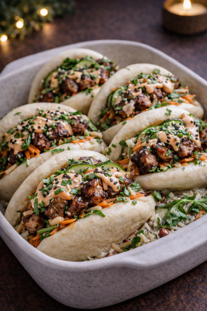 • 6–8 gotowych bułeczek bao (mrożonych lub świeżych, do parowania)