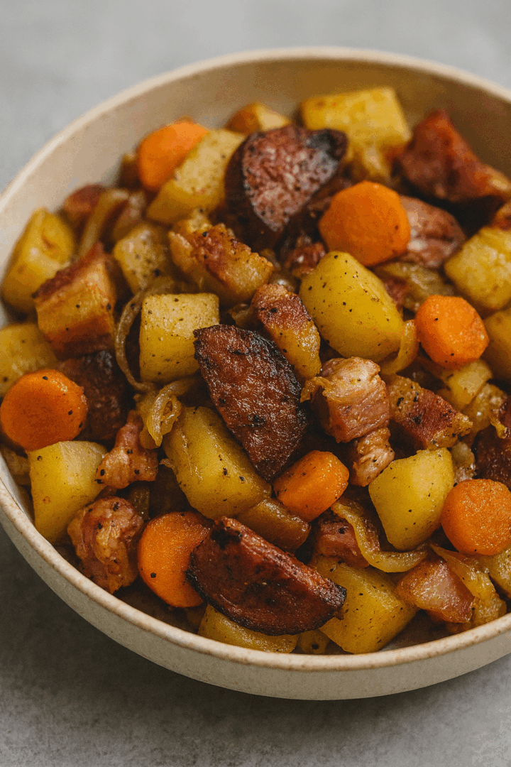 Chłopski garnek – jednogarnkowe danie z kiełbasą, boczkiem i ziemniakami