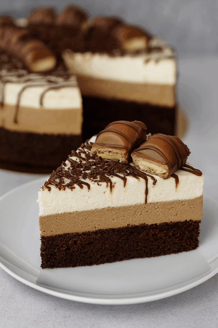 Wierzch udekoruj kawałkami Kinder Bueno, startą czekoladą i polewą.