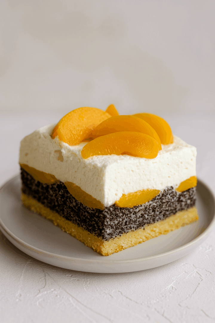 Ciasto makowe z brzoskwiniami i bitą śmietaną