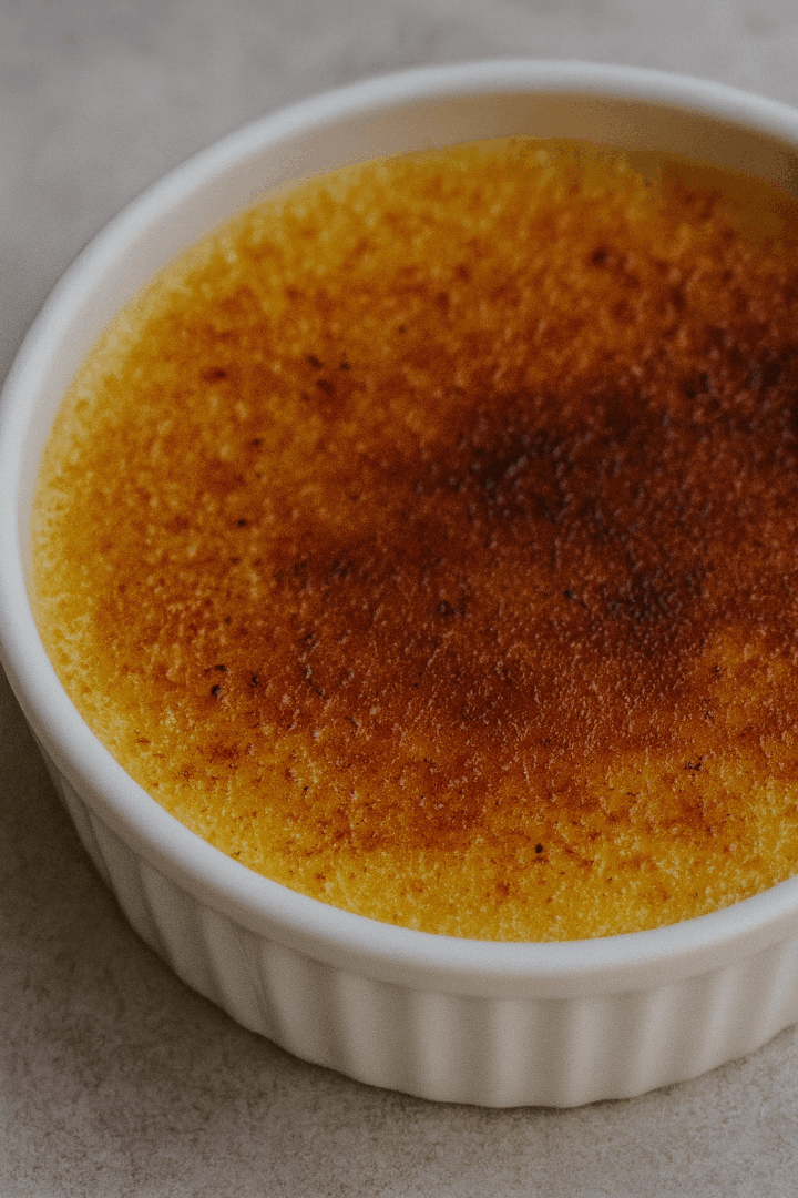 Skarmelizuj cukier palnikiem kuchennym (lub pod mocnym grillem w piekarniku przez 1–2 minuty), aż utworzy się cienka, chrupiąca skorupka.