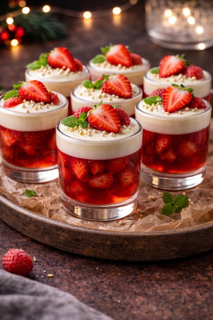 Deser w pucharkach: truskawki w galaretce z kremem waniliowym