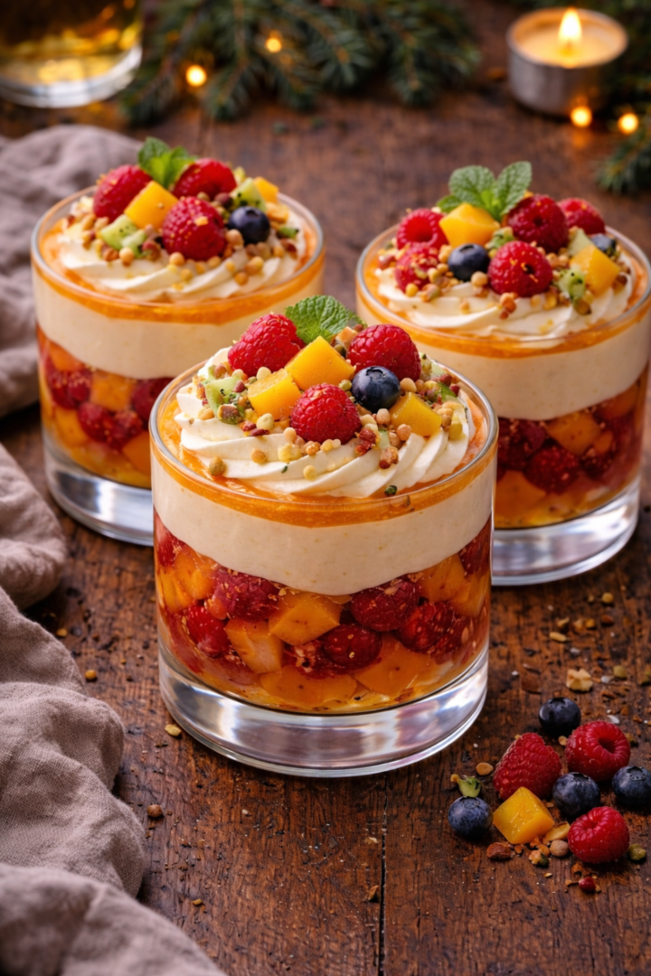 Deser w pucharkach z musem mango, malinami i kremem mascarpone