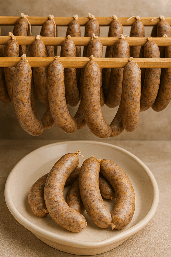 Zawieś kiełbaski na 1–2 h w chłodnym (4–6 °C), przewiewnym miejscu, by osłonki się lekko osuszyły i mięso stężało.