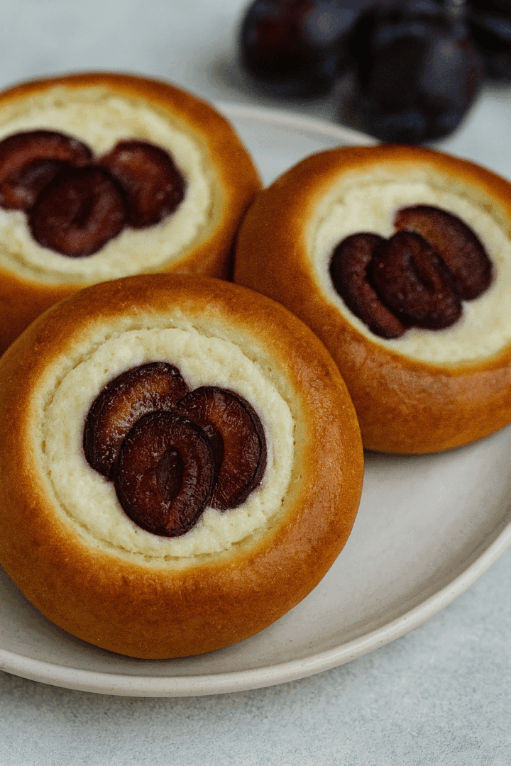 Do środka nałóż porcję masy serowej i połówki/ćwiartki śliwek.