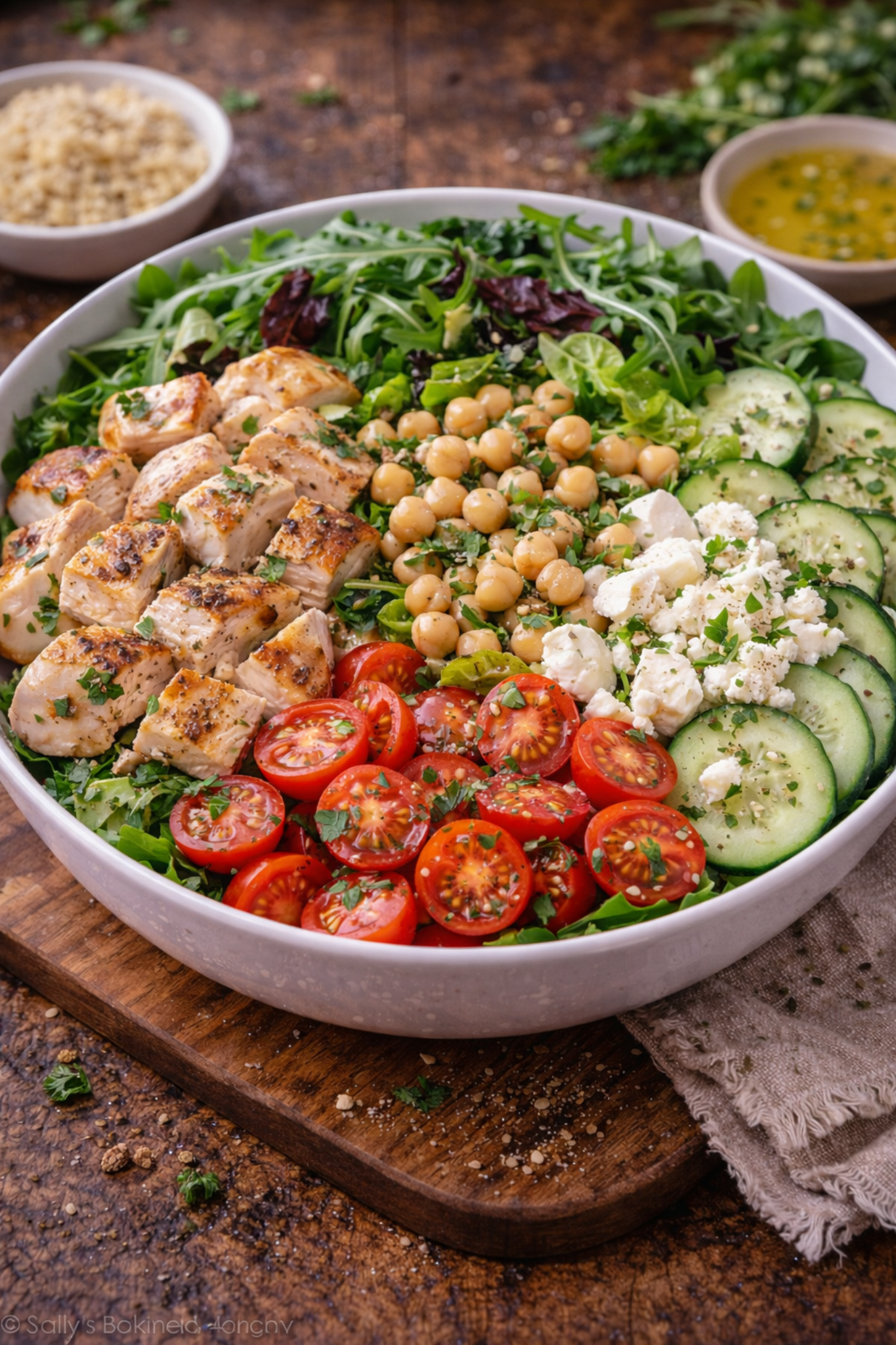 Składniki: Sałatka 300–400 g fileta z piersi kurczaka 120 g miksu sałat/rukoli 1 puszka ciecierzycy (ok. 240 g…