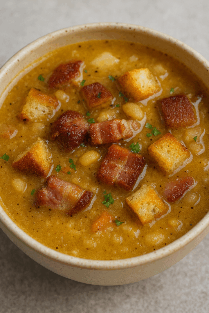 Podawaj gorącą zupę z grzankami i posypaną świeżą pietruszką.