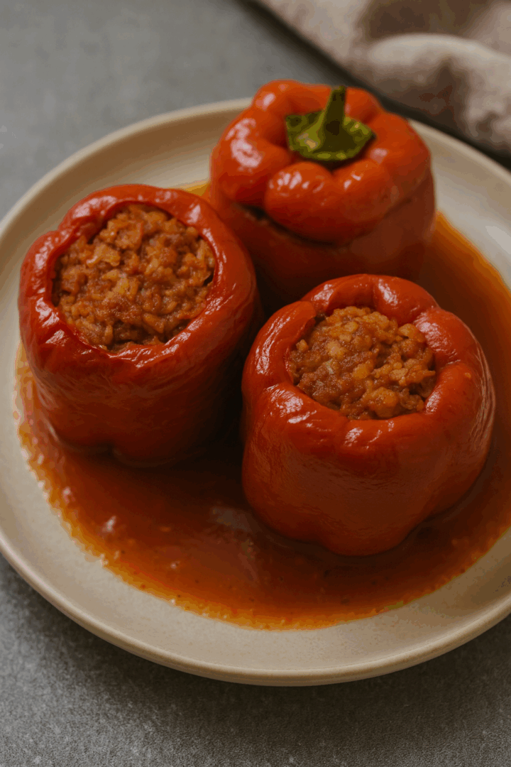 Włóż papryki, przykryj i gotuj na małym ogniu ok. 40 minut lub piecz w piekarniku nagrzanym do 180°C przez 45 minut.