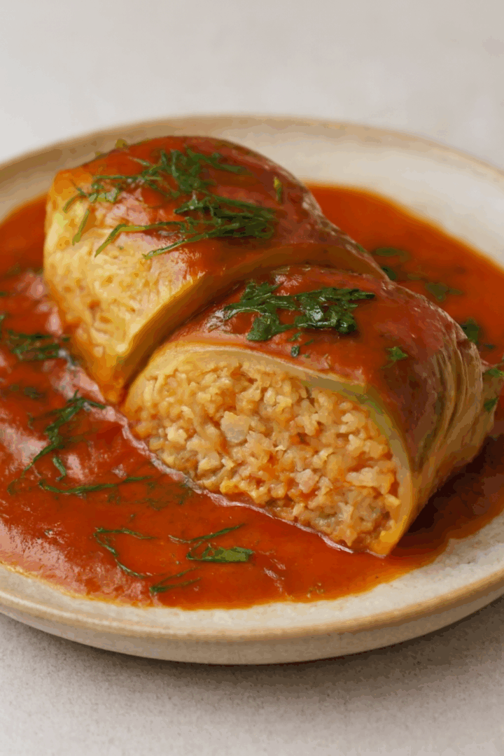 Gołąbki z mięsem i ryżem w sosie pomidorowym