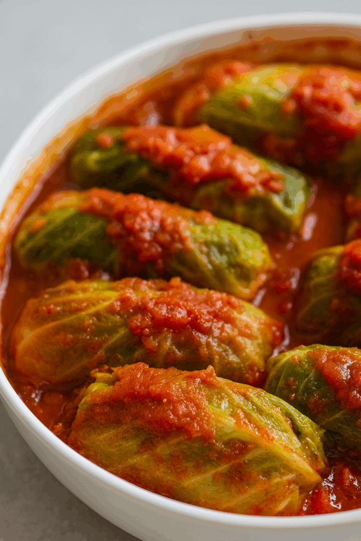 Gotowe gołąbki polej gorącym sosem pomidorowym.
