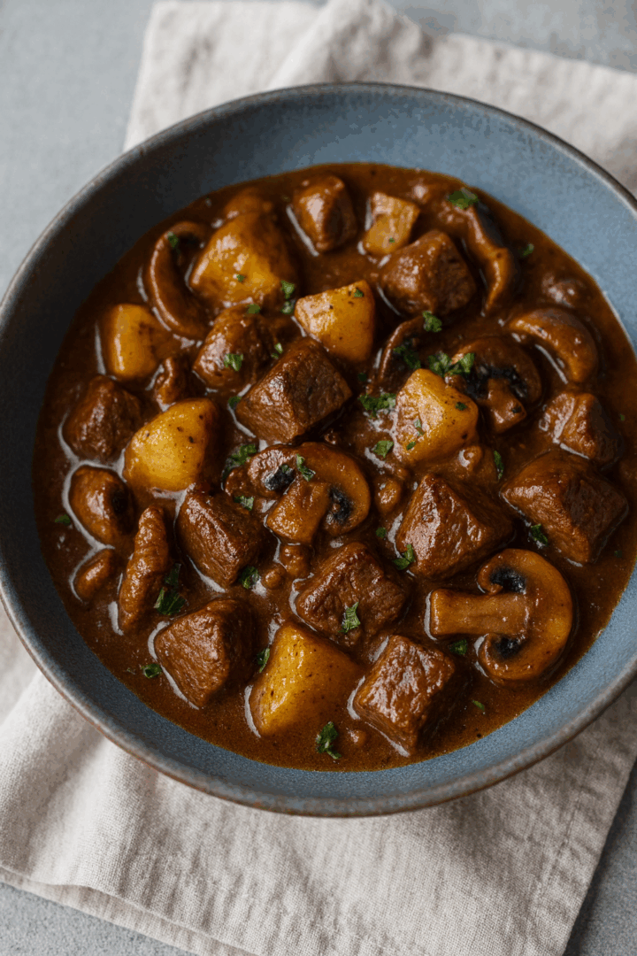 Gulasz z mięsem, ziemniakami i grzybami