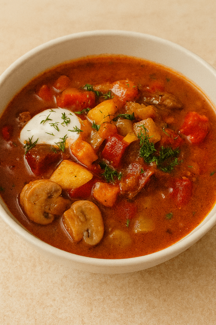 Gulasz ziemniaczano-pieczarkowy z papryką i kleksem śmietany