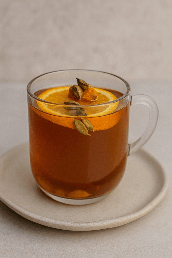 Do kubka lub filiżanki włóż plaster pomarańczy, kurkumę i ziarenka kardamonu.