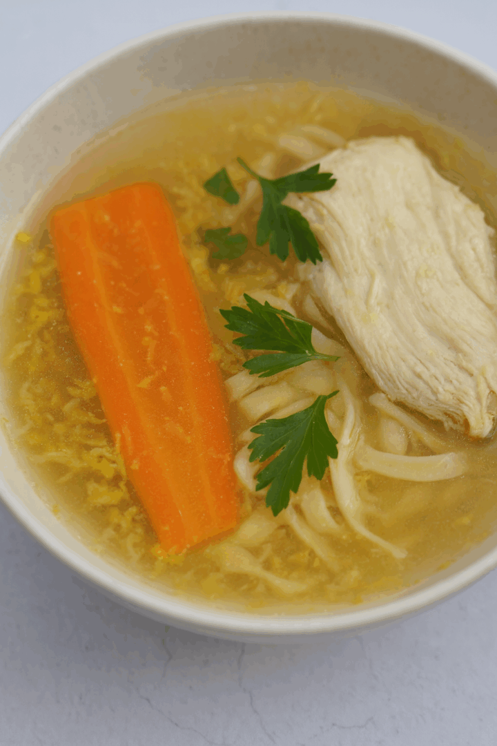 Rosół przecedź, podawaj z ugotowanym makaronem, kawałkami mięsa, marchewką i świeżą natką pietruszki.
