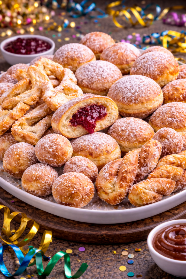 Karnawałowy zestaw słodkości: pączki z marmoladą, mini pączki serowe i faworki