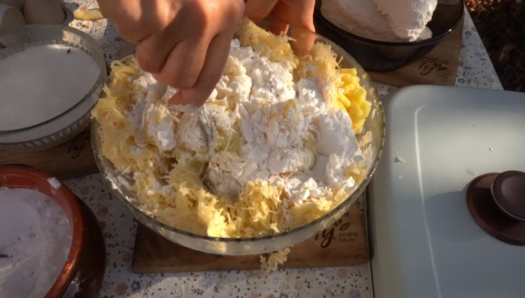 Ziemniaki: Ugotuj 1 kg ziemniaków, przeciśnij przez praskę. Zetrzyj 0,5 kg surowych ziemniaków na drobnej tarce i odciśnij z nadmiaru wody.
