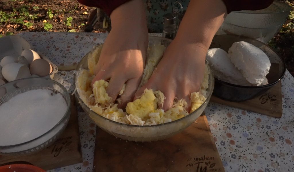 Ciasto: Połącz ziemniaki, dodaj 2 jajka, 5-6 łyżek mąki ziemniaczanej, sól, zagnieć.