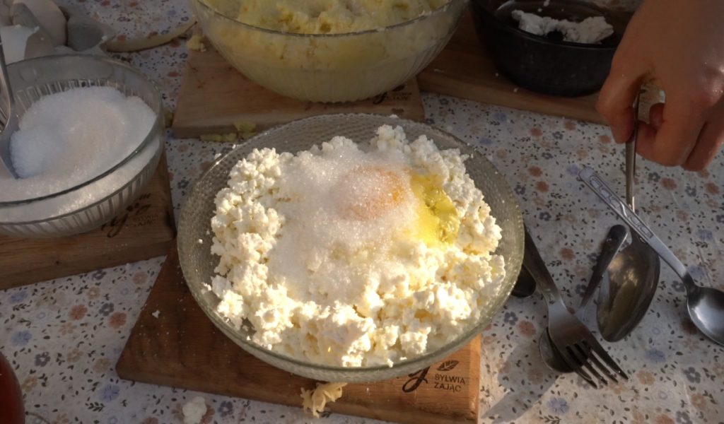 Nadzienie: Twaróg rozgnieć, dodaj jajko i cukier. Wymieszaj.
