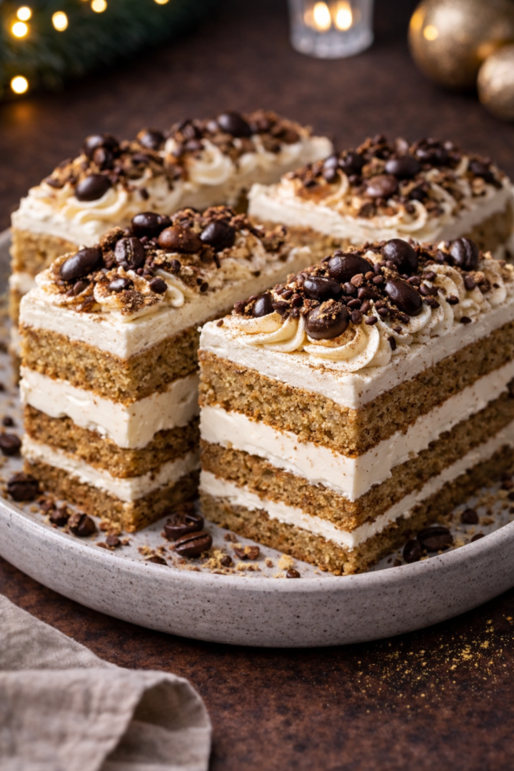 Na pierwszy blat biszkoptu wyłóż połowę kremu i wyrównaj. Przykryj drugim blatem i rozprowadź pozostały krem na wierzchu. Udekoruj wierzch rozetkami z kremu, posiekaną czekoladą, ziarnami kawy i oprósz kakao.