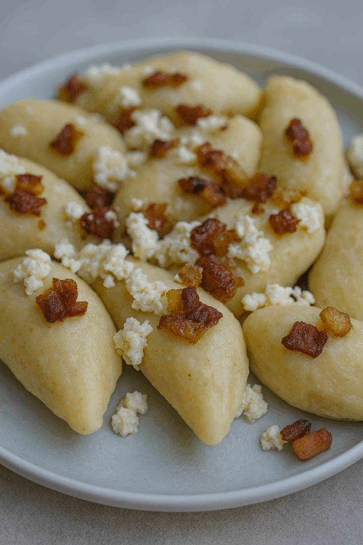 Gorące kluski podawaj polane skwarkami i posypane świeżym twarogiem albo ze śmietaną i cukrem, jeśli chcesz wersję na słodko.