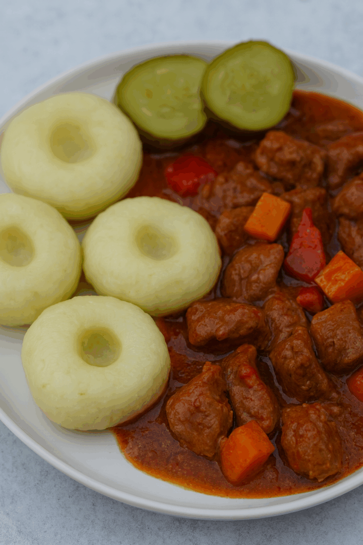 Kluski śląskie z gulaszem wołowym