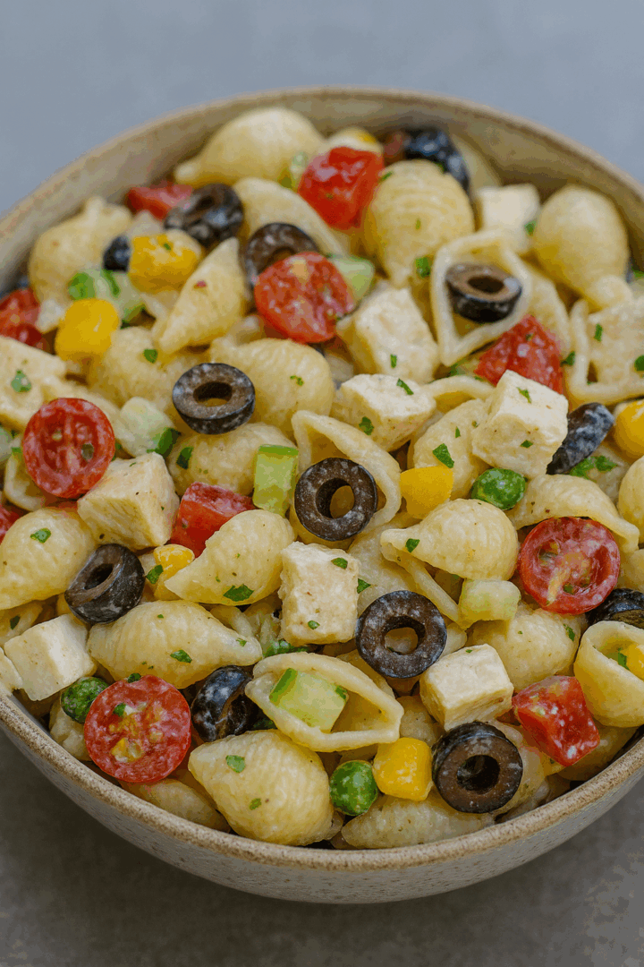 W dużej misce wymieszaj makaron, kurczaka, warzywa, groszek, kukurydzę i ser feta.