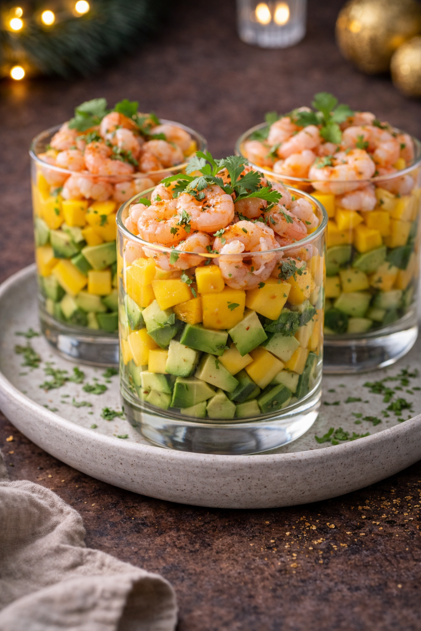 Warstwowa sałatka z krewetkami, mango i awokado w szklankach