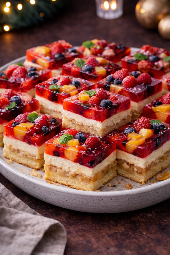 Kostki biszkoptowe z kremem waniliowym i galaretką owocową