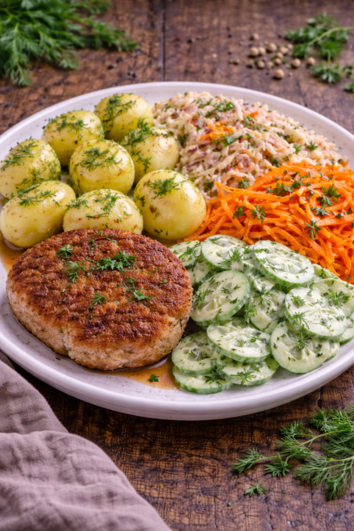 Kotlet mielony z ziemniakami, mizerią oraz surówkami
