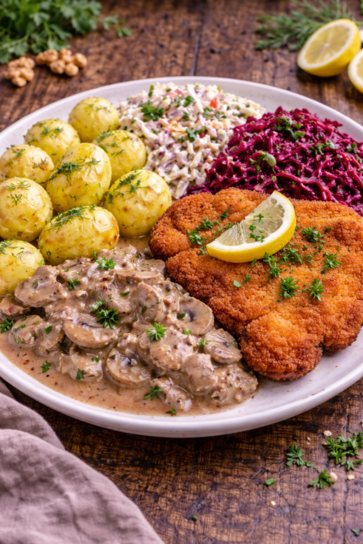 Kotlet schabowy, ziemniaki z koperkiem, sos pieczarkowy i dwie surówki