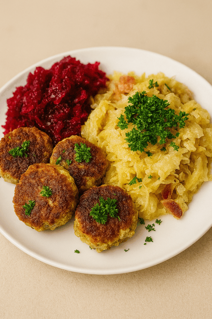Kotlety mielone z duszoną kapustą kiszoną i surówką z buraczków