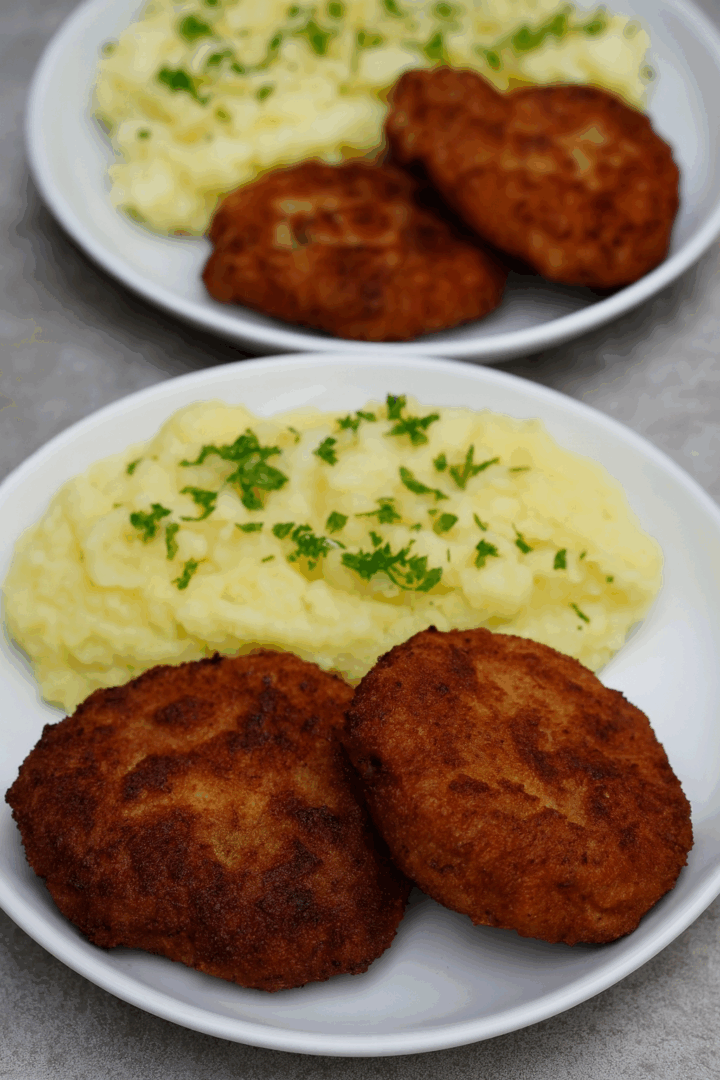 Na talerzu ułóż porcję puree, obok kotlety mielone, a całość posyp świeżą natką pietruszki.