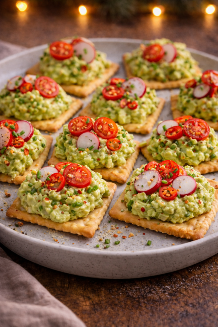 Krakersy ułożyć na talerzu i na każdy nałożyć porcję pasty awokado.