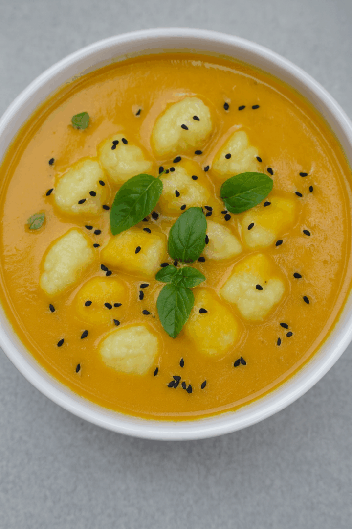 Do miski nalej krem z dyni, dodaj kluski, posyp czarnuszką i udekoruj listkami bazylii.