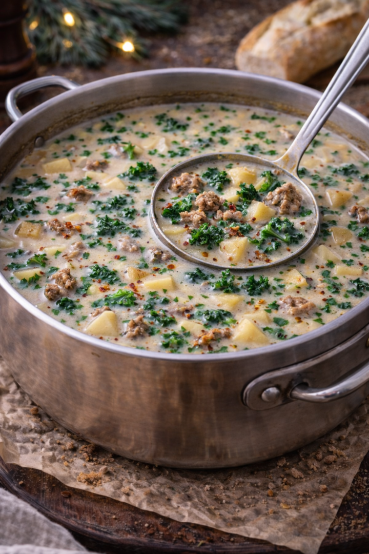 Kremowa zupa ziemniaczana z jarmużem i mięsem mielonym