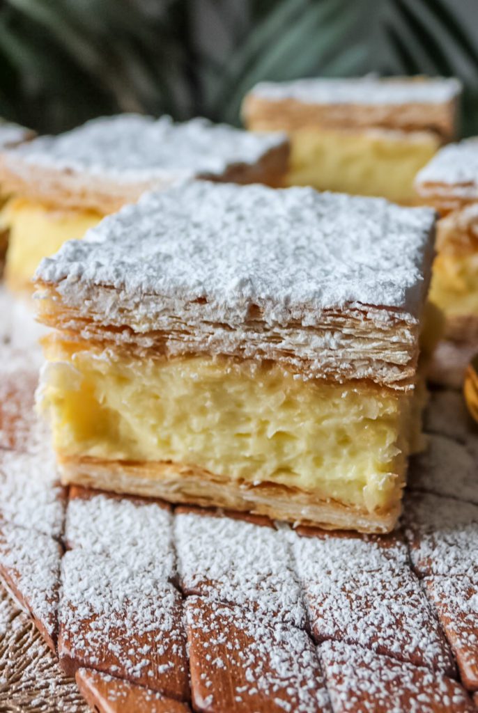 Przygotuj dwie blaszki. Wyłóż je papierem do pieczenia. Na papier do pieczenia wyłóż ciasto francuskie. Nakłuj je widelcem. Wstaw do rozgrzanego do 200 stopni piekarnika na 20/25 minut. Po upieczeniu przełóż ciasto na kratkę do wystygnięcia. Teraz czas na krem budyniowy. Do rondelka wlej 400ml mleka. Dodaj również cukier. Całość zagotuj. Gdy mleko się zagotuje wlej do niego śmietanę kremówkę oraz pastę waniliową. Całość zagotuj. W kubku wymieszaj pozostałą ilość mleka wraz z żółtkami, mąką ziemniaczaną, a także pszenną. Po wymieszaniu wlej wszystko do rondelka, w którym gotuje się mleko z cukrem i śmietanką. Mieszaj by nie zrobiły się grudki- tak jak budyń. Poczekaj aż masa zgęstnieje, a następnie odstaw do całkowitego wystygnięcia.