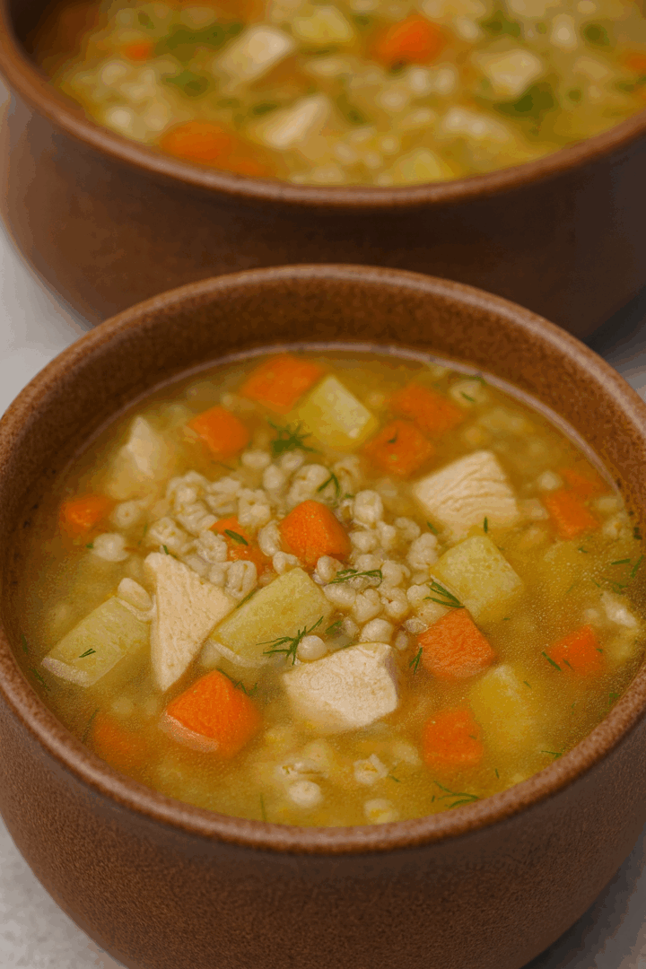 Podawaj gorący krupnik posypany świeżym koperkiem.
