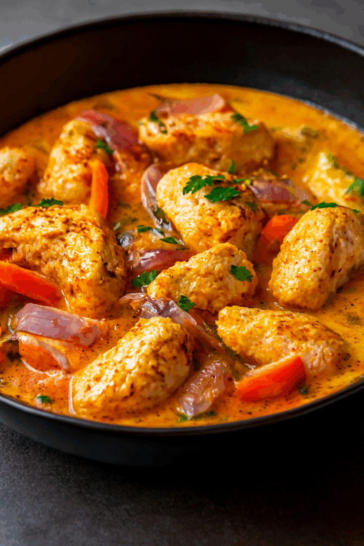 Kurczak duszony w kremowym sosie paprykowym z warzywami