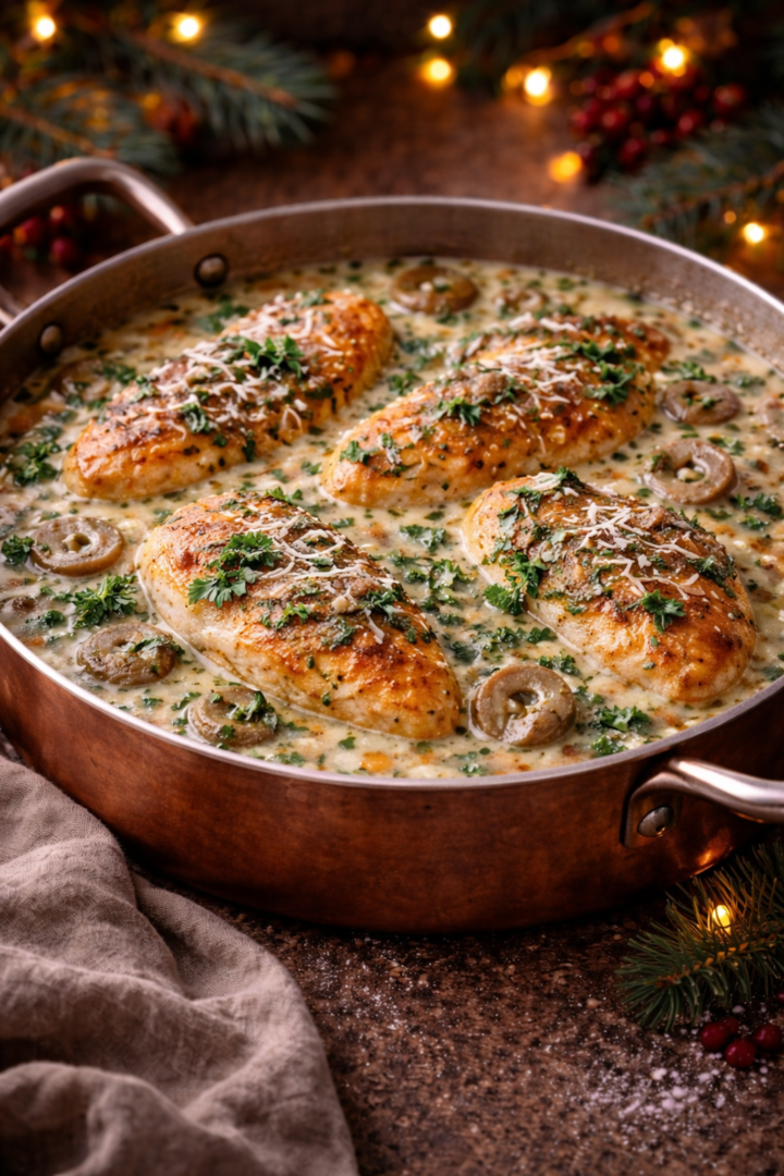 Kurczak w sosie śmietanowo-pieczarkowym z oliwkami