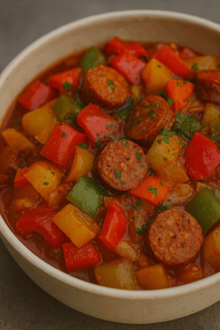 Dodaj kiełbasę i smaż przez 5–7 minut, aż się zrumieni.