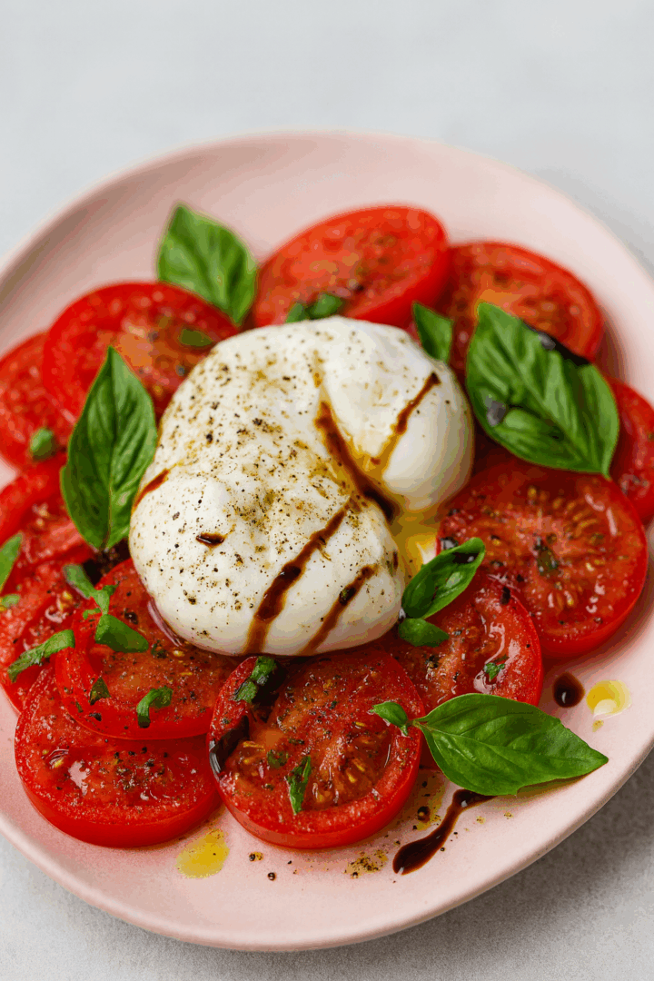 Umieść kulkę burraty na środku talerza (w całości lub lekko rozciętą, by wypłynęło kremowe wnętrze).