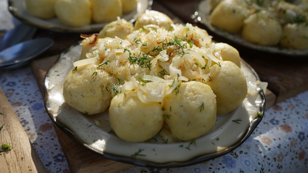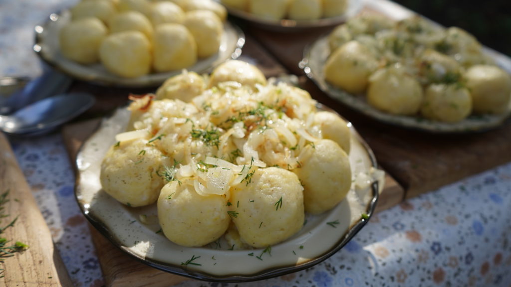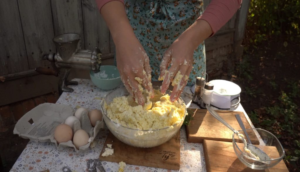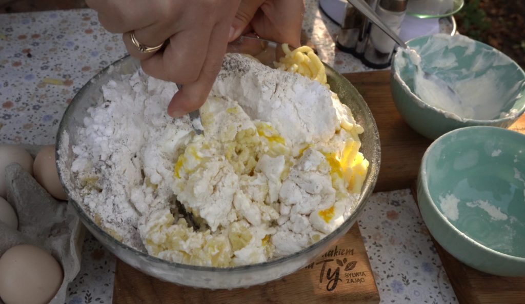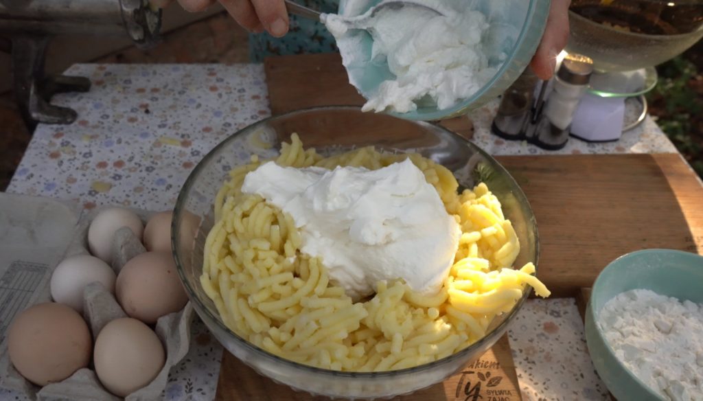 Ziemniaki: Ugotuj 1 kg ziemniaków, przeciśnij przez praskę. Przełóż do miski. Do ziemniaków dodaj twaróg.