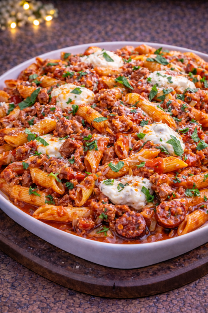 Makaron penne z sosem pomidorowym, kiełbasą i burratą