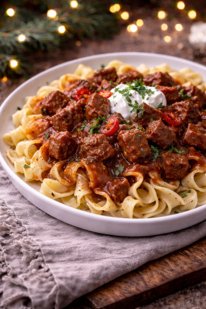 Makaron wstążki z gulaszem wołowym i sosem paprykowym