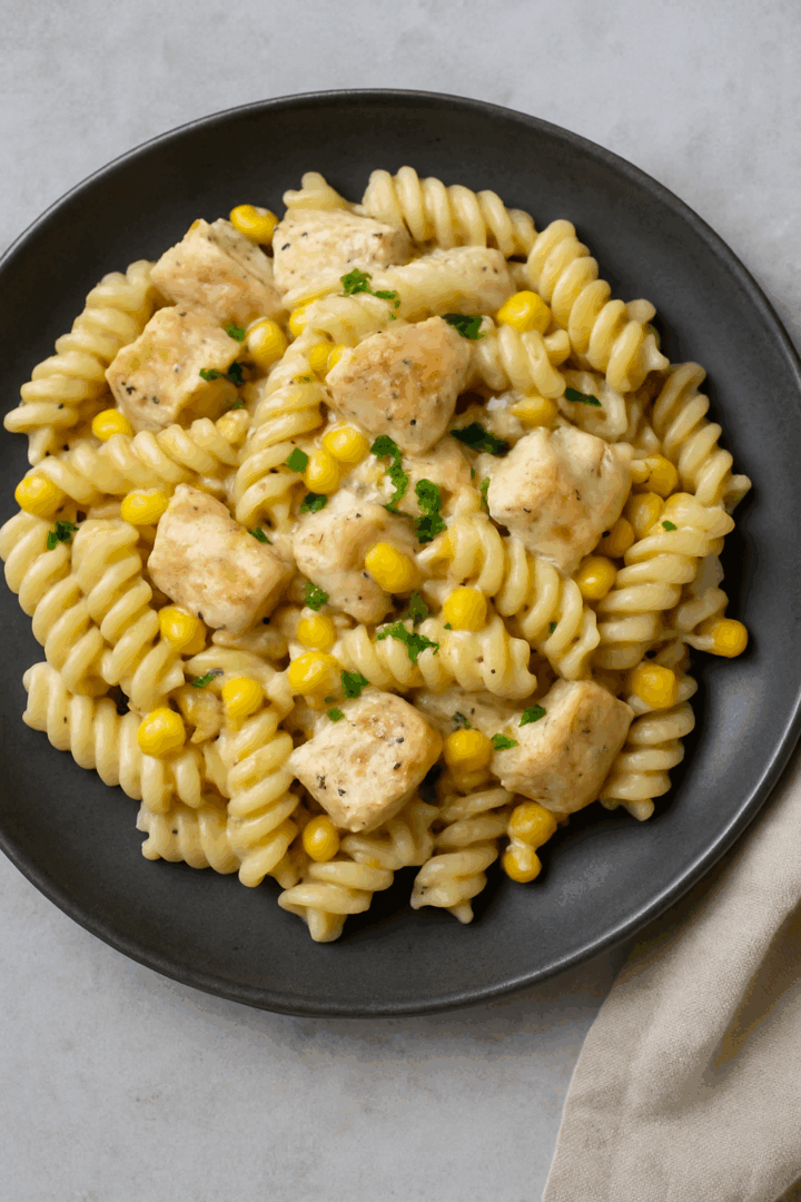 Makaron z kurczakiem i kukurydzą w sosie śmietanowym