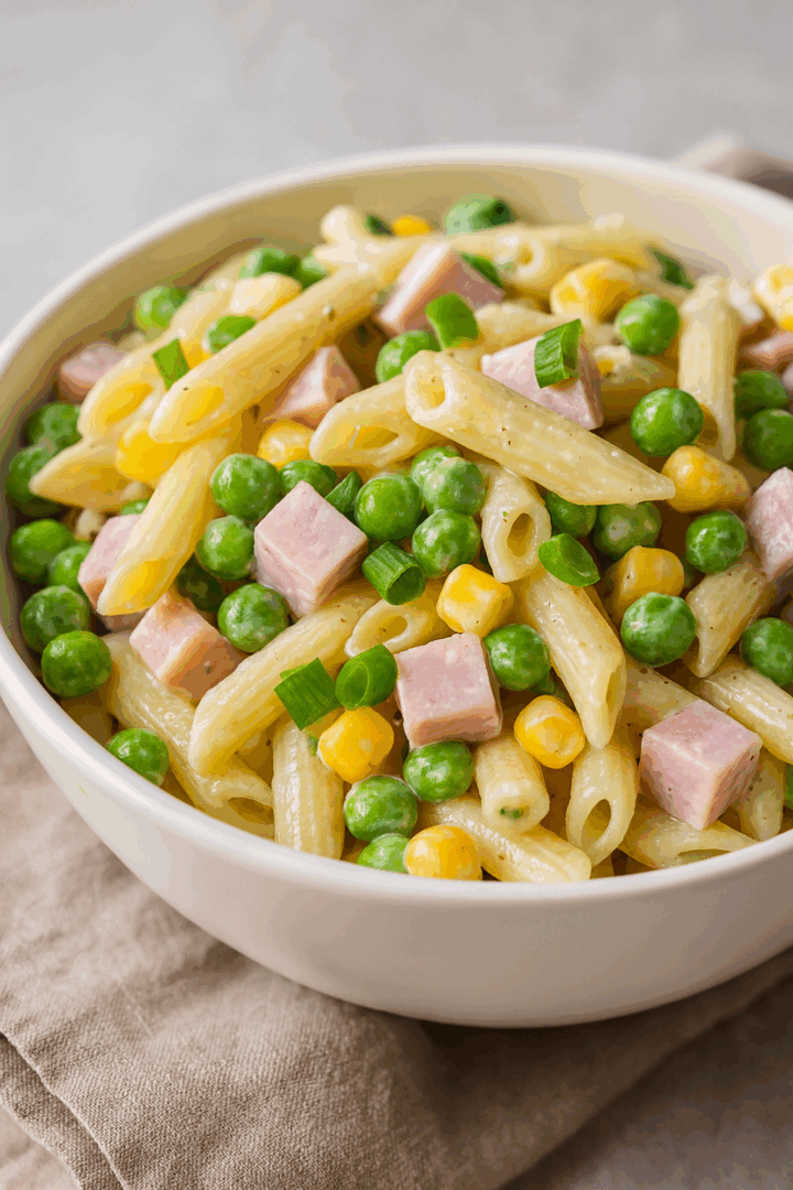 Dodaj groszek, kukurydzę i śmietankę, dopraw solą i pieprzem. Gotuj 3–4 minuty, aż sos lekko zgęstnieje.