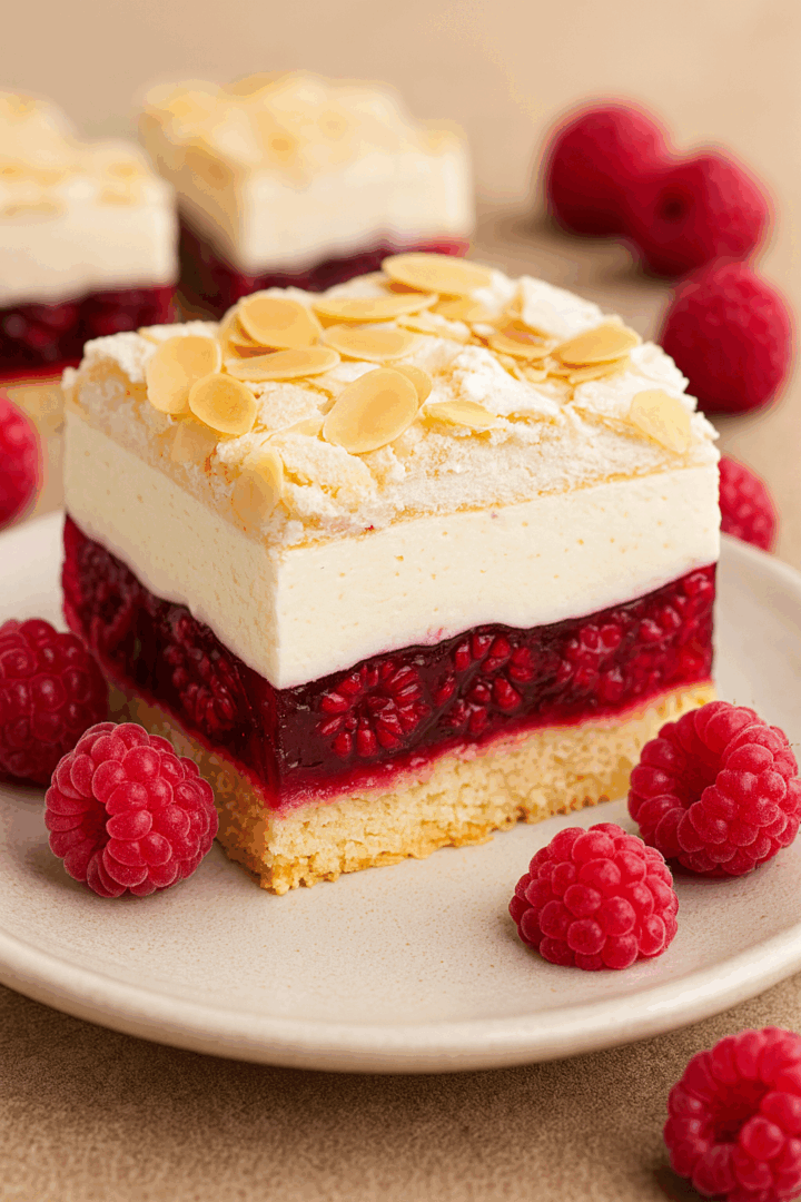 Na wierzch ciasta ułóż świeże maliny i posyp płatkami migdałów.